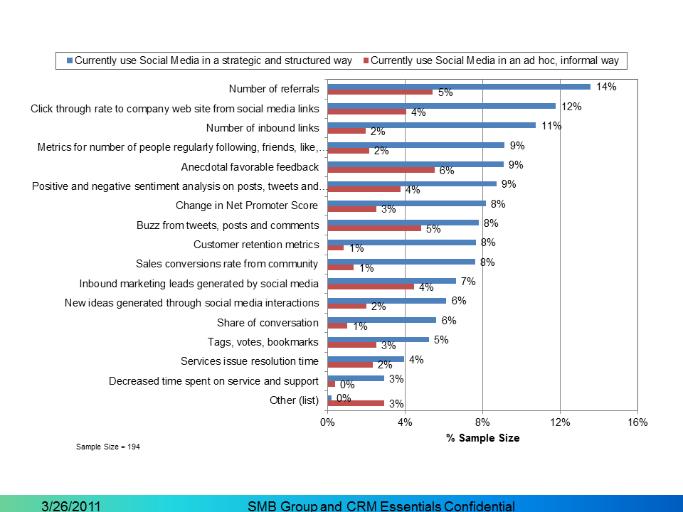 - Companies that use social media in an ad hoc manner are more likely to rate “softer”measurements, such as anecdotal favorable feedback (6%) and buzz from social media(4%) as top tracking criteria and yardsticks for success.