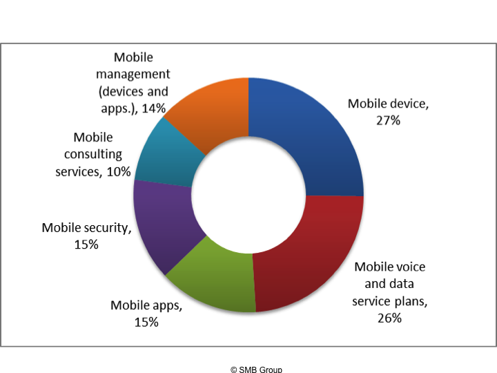 As shown in Figure 3, SMBs currently spend the bulk of their mobile budgets on voice and data services and devices. But SMBs are also opening their wallets wider for mobile consulting, management, security and apps.