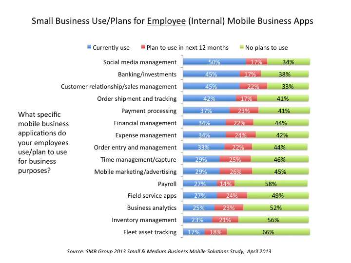 SMBs are also adopting mobile apps for very business-specific functions. So, for things like order entry or inventory lookup, or to log time and attendance or enter payroll. Mobile is becoming part and parcel of how we conduct business.