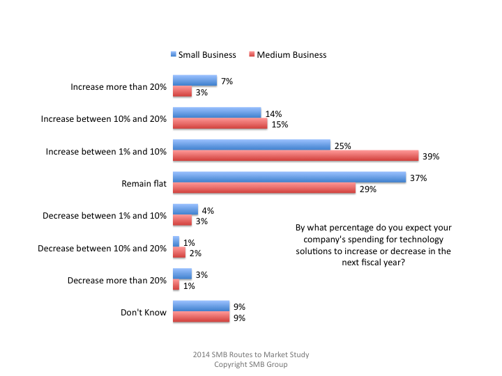 SMB Group recently wrapped up our 2014 Small and Medium Business Routes to Market Study, in which we looked how U.S. SMB (small businesses are defined as those with 1-99 employees, medium businesses as those with 100-999 employees) technology adoption and the buying cycle in ten key solution areas. As part of this study, we gather SMB perspectives their top business challenges, how technology impacts their businesses and technology spending plans.
