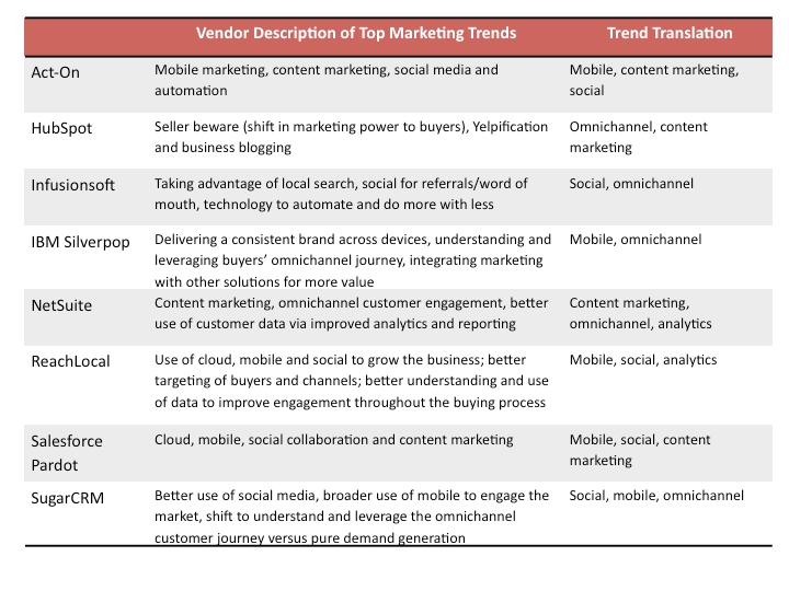 Moving beyond cloud and automation as fairly obvious trends, vendors also agree about many of the top marketing trends that SMBs must capitalize on, although they describe these trends differently (Figure 1). These trends include: