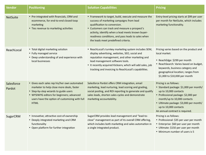 - Cost and commitment: SMBs upgrading from a simple email marketing solution need to prepare for a bit of sticker shock. Pricing for the vendors we cover in this report varies widely but typically runs from about $200 to $1,000 per month for “pure play” marketing automation vendors. Meanwhile, vendors that bundle marketing automation into an integrated CRM (e.g., SugarCRM) or full business solution suite (e.g., NetSuite) charge per-user fees. In addition to price, consider whether a vendor offers annual, monthly and/or yearly contracts, and determine your willingness to lock in to a short- or longer-term commitment.