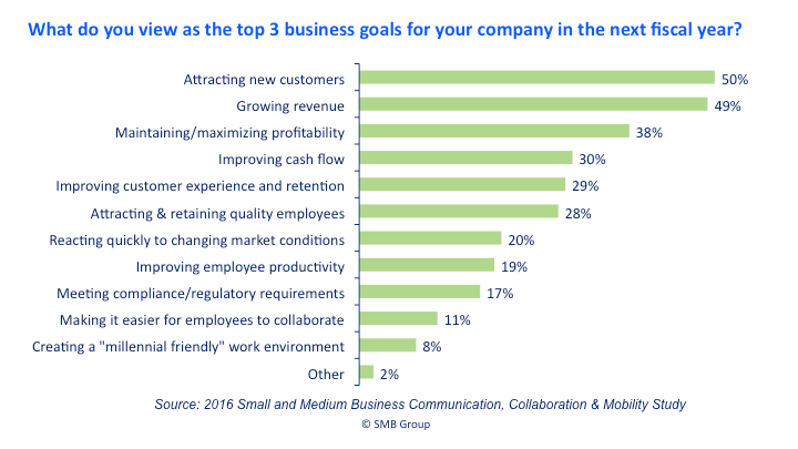 SMB Group research consistently shows SMBs view attracting new customers, growing revenues, maintaining profitability, improving cash flow and improving customer experience and retention as their top business goals (Figure 1).