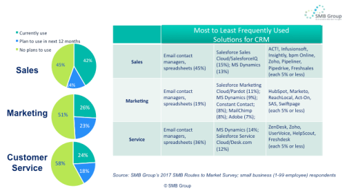 The small business CRM in small business is still very under penetrated and fragmented (Figure 2).In fact, most small businesses still use email, spreadsheets, contact managers and point solutions to manage sales, service and marketing.