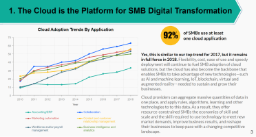 In fact, “The Cloud is the Platform for SMB Digital Transformation” was the #1 trend in SMB Group’s 2018 Top 10 SMB Technology Trends. As a result, the cloud is becoming the backbone that enables SMBs to take advantage of new technologies they need to sustain and grow their businesses.