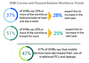 According to SMB Group’s SMB 360: Connecting the Dots Between Business and Technology Study, 37% of SMBs say that 20%or more of the workforce telecommutes at least one day per week, and 28% of SMBs expect the percentage of employees that telecommute to rise.