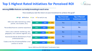 Among SMBs currently investing in each type of initiative, SMBs’ indicate that adding a new sales channel and personalizing the customer experience (both of which are also among the top five current technology investment areas) get the highest marks for return on investment.