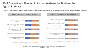 For instance, compared to SMBs that have been in business for more than 10 years, SMBs that have been in business fewer than 10 years are roughly twice as likely to be planning to increase their technology spending as older firms and are 1.4 times more likely to forecast revenue growth.