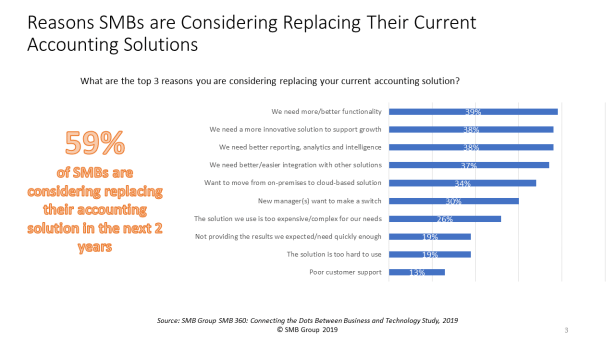 In fact, SMB Group data shows that 59% of SMBs are considering replacing their current accounting solution because they need better functionality, more access to innovation, and better reporting and analytics—benefits that these new technologies will provide.