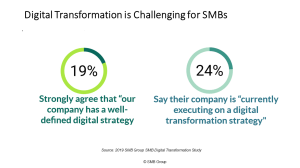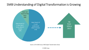 A quick Google search will identify “digital transformation” as one top buzzword out there today. The good news is that the percentage of SMBs say they’ve heard of digital transformation and understand what it means has grown from 33% in 2017 to 57% in 2019. But the bad news is that it’s still a fuzzy term for many—and most SMBs are uncertain as to how to tackle it.