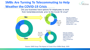 One of the things we do know is that businesses that can do so are relying heavily on telecommuting and remote working to keep their operations going. According to SMB Group’s Impact of COVID-19 on SMBs study, 80% of SMBs with existing work-from-home programs are now expanding them as they try to keep their businesses going. Meanwhile, among SMBs that lacked telecommuting options prior to COVID-19, 24% have now established them, and 29% plan to do so.