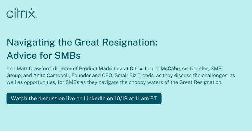 Last week, I had the pleasure of joining Matt Crawford, director of Product Marketing at Citrix, and Anita Campbell, Small Business Trends Founder and CEO, to discuss the challenges, as well as opportunities that small and medium businesses (SMBs) face during the current “Great Resignation” on a LinkedIn Live event.