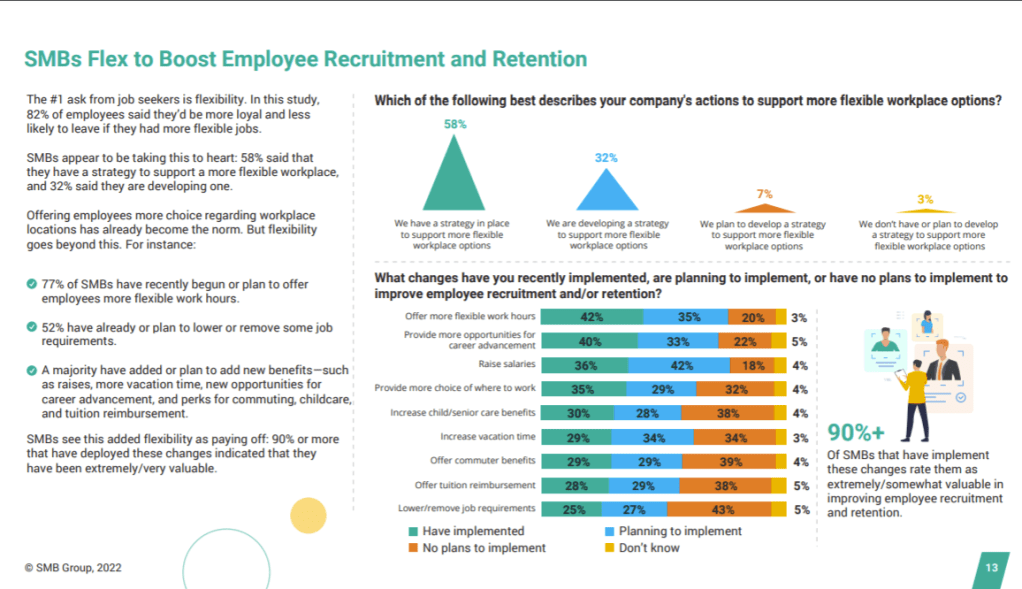 - Over half of SMBs said that they have a strategy to support a more flexible workplace. Many said they have recently begun, or plan to offer employees options for more flexible hours, better opportunities for career advancement, and new benefits to improve employee recruitment and retention.