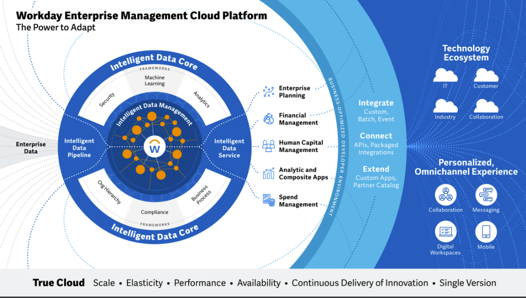 So, Workday crafted its “enterprise management cloud platform,” enabling it to deliver a set of integrated applications that run under a unified business process, common object and security framework.