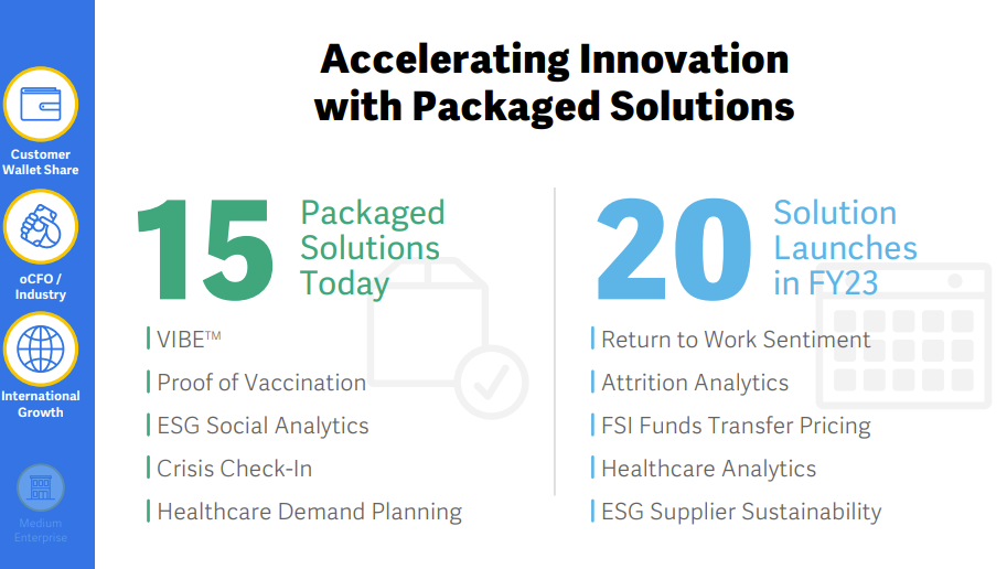 The packaged solutions approach should make Workday’s offerings more attractive in the midmarket, and also make it easier for partners to sell. To date, the company has introduced 15 packaged offerings, and has 20 planned for fiscal 2023.