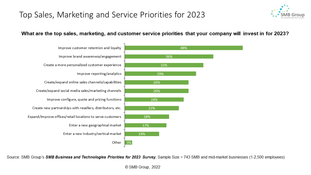 But ever-escalating customer expectations are making customer service a top priority for SMBs, who ranked customer service as the top sales, marketing, and service investment area for their businesses in 2023, according to SMB Group’s SMB Business and Technologies Priorities for 2023 survey.