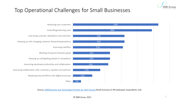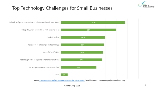 According to SMB Group research, small businesses struggle just to figure out which solution will work best is often the biggest hurdle—and are also challenged by integration issues and perennial “lack of” problems—lack of time, money, and expertise. As a result, small businesses often stick with a tangle of disjointed tools to manage these functions.