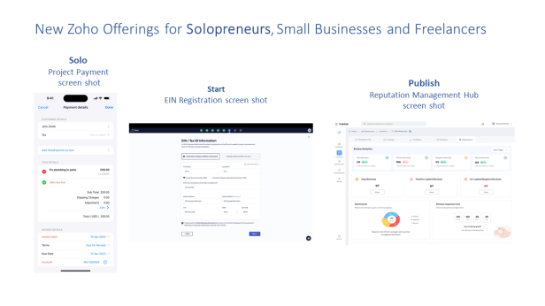 At the other end of the spectrum, Zoho announced four new solutions to help solopreneurs and small businesses to start, build, and run their operations.