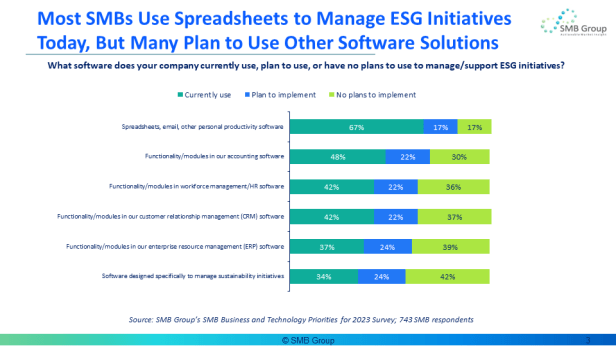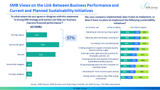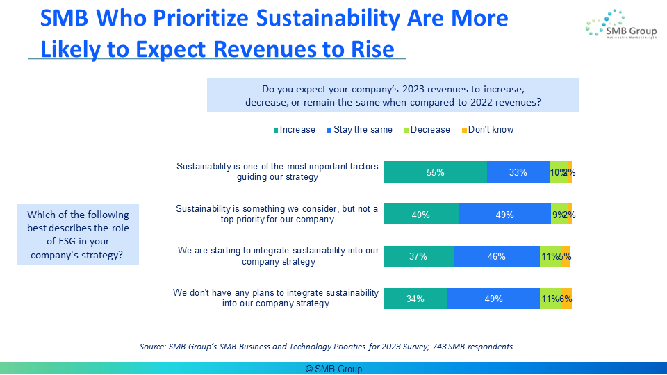 But how important are sustainability initiatives for small and medium businesses (SMBs), and what ESG strategies and practices are they putting in place? SMB Group’s SMB Business and Technology Priorities for 2023 survey addressed this topic, among others, in detail.