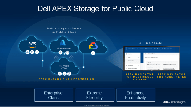 Dell APEX Storage for Public Cloud brings a collection of new offerings spanning block, file and data protection into the APEX portfolio, including the introduction of APEX Navigator, which provides the “connective tissue” to manage storage across AWS and Microsoft Azure clouds, and monitor across public cloud and their on-premises systems.