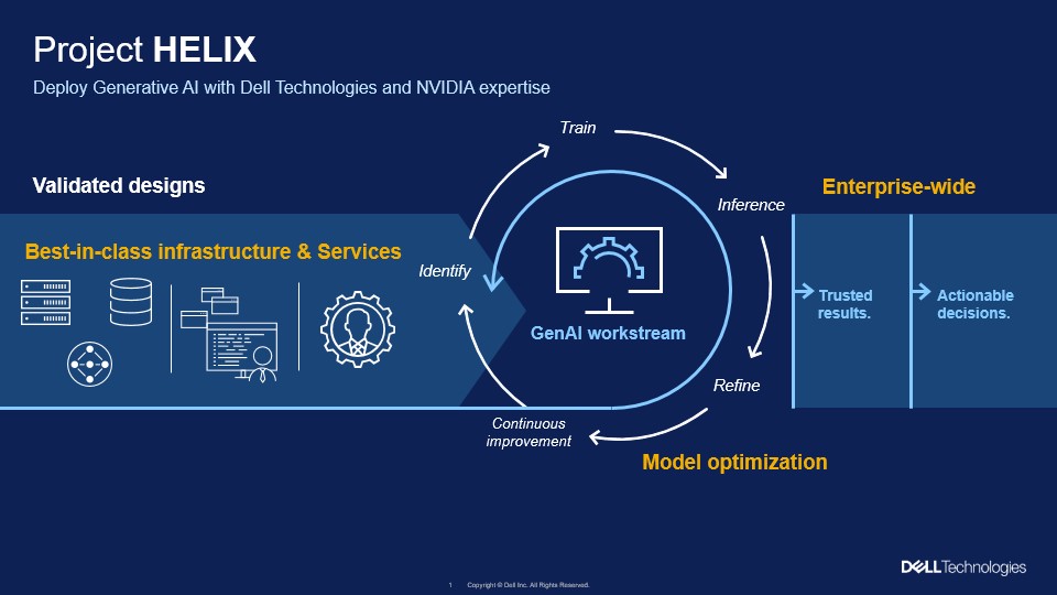 Dell announced that it is teaming with Nvidia on Project Helix, a platform designed to enable enterprises of all sizes to build and run their custom AI models. Jeff Clarke posited that many large companies will want to use their proprietary data in AI models, but may be concerned about security and performance issues, as well as surprise bills when they “run up the meter.” Project Helix will provide them with a blueprint, expertise, pre-built tools, and the Dell and Nvidia infrastructure and software they need and provide faster performance as the amount of data flowing through their AI models grows.