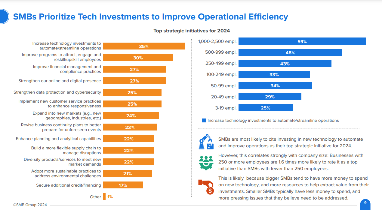 - SMBs are most likely to cite investing in new technology to automate and improve operations as their top strategic initiative for 2024.