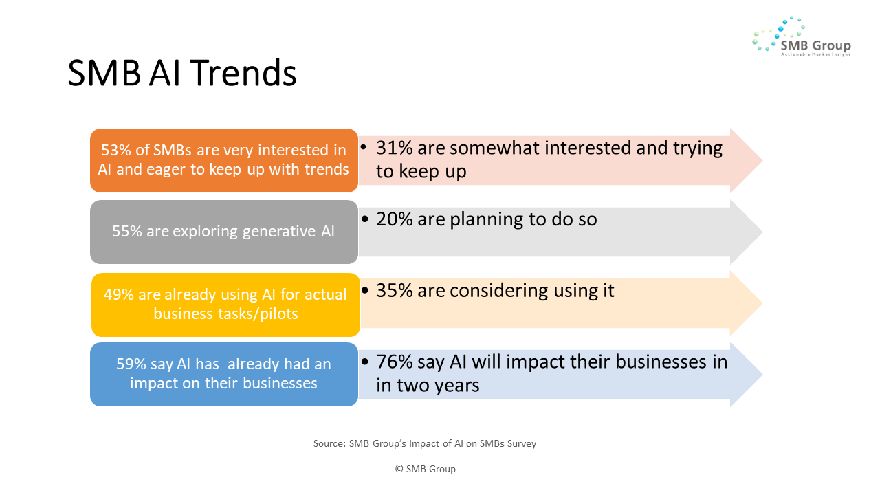 SMBs have an appetite for AI benefits, as indicated in SMB Group’s 2023 Impact of AI on SMBs survey. A majority of SMBs indicated that they want to keep up with AI trends, are exploring generative AI, and are already using or considering using AI. As importantly, 59% say AI has already impacted their businesses.